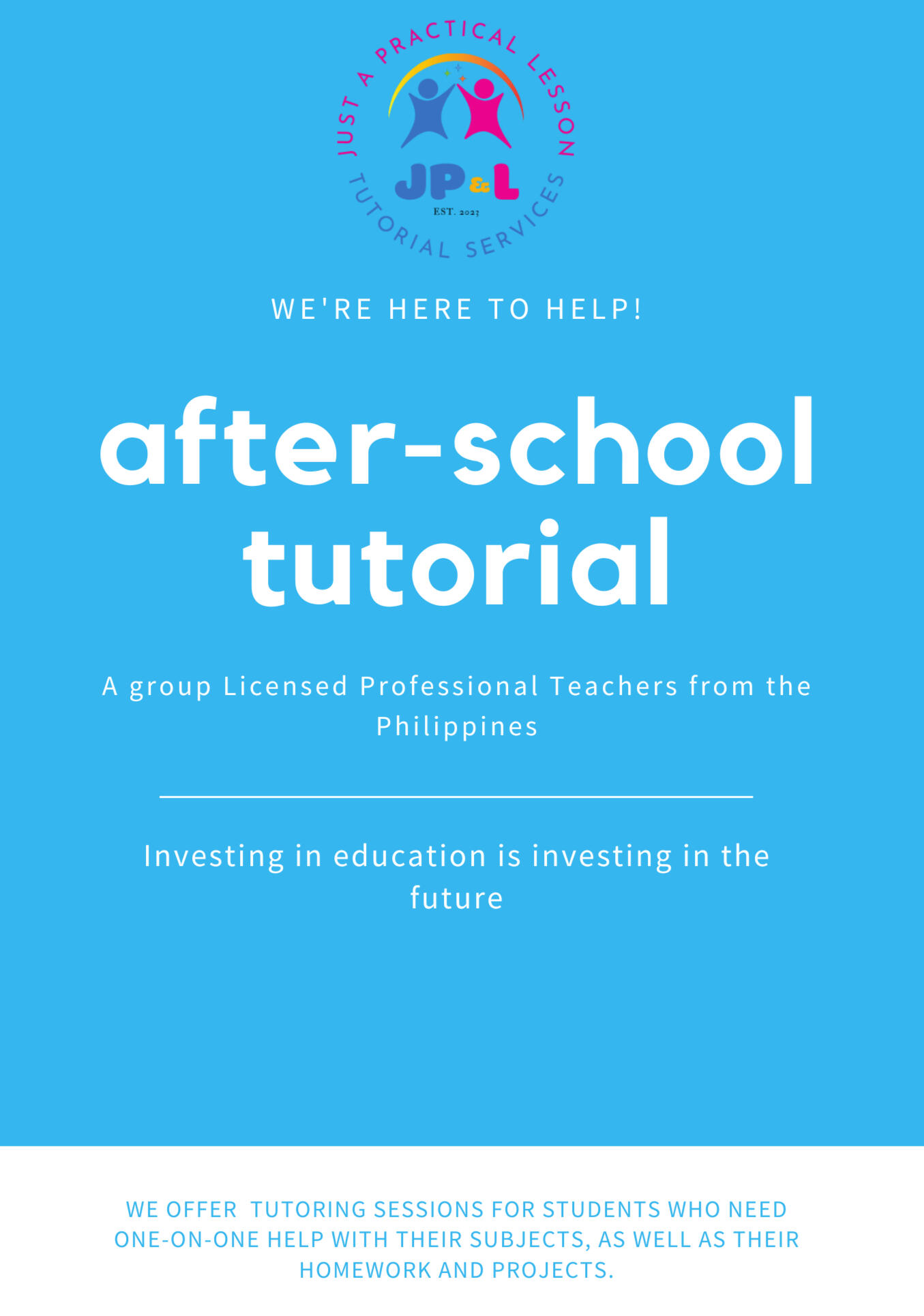 "We are a team of licensed professional teachers dedicated to providing top-notch tutorial services. With years of experience and expertise in various subjects, we aim to support students in reaching their full potential and achieving academic success. Our personalized approach to teaching and individualized attention to each student sets us apart from the traditional classroom setting. Trust us to help guide you towards your academic goals and a brighter future."
